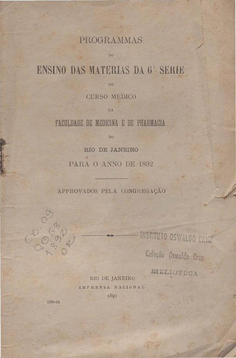 Programmas do ensino das materias da 6º série do curso medico da Faculdade de Medicina e de Pharmacia do Rio de Janeiro para o anno de 1892